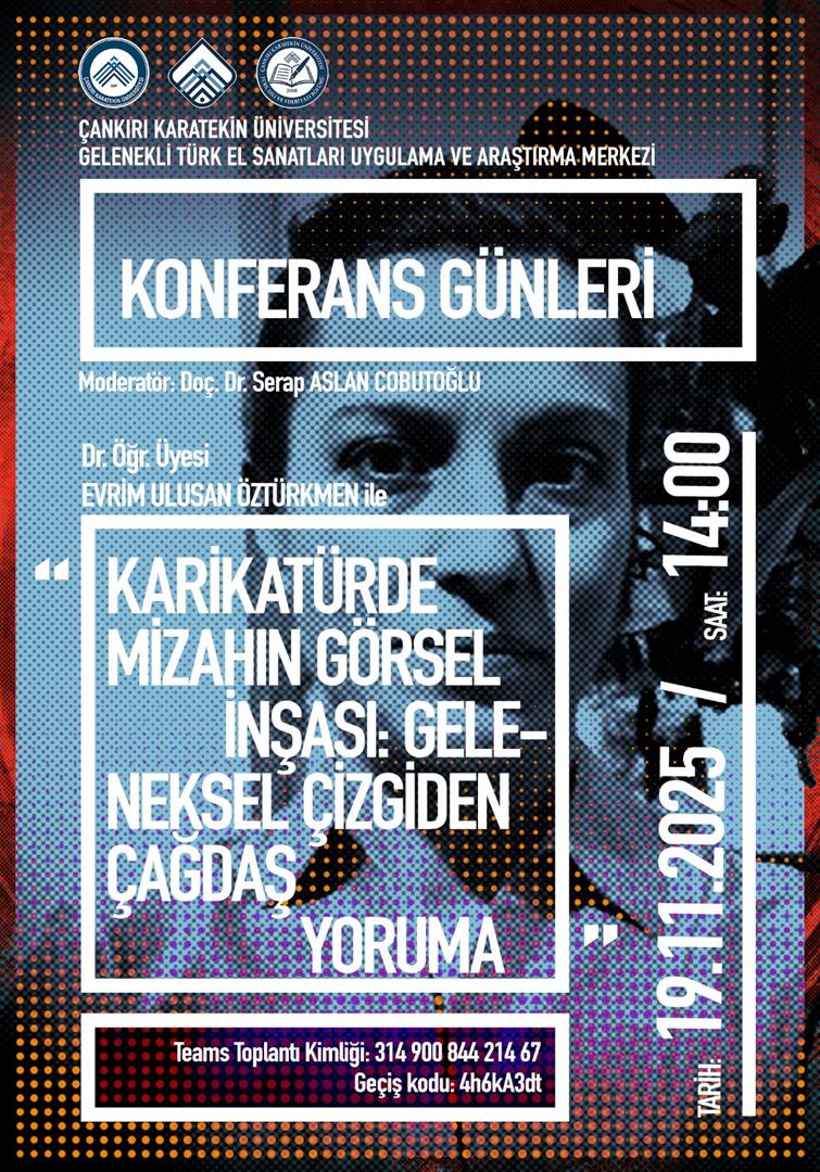 Gelenekli Türk El Sanatları Uygulama ve Araştırma Merkezi tarafından düzenlenen konferans günleri kapsamında Dr. Öğr. Üyesi Evrim Ulusan Öztürkmen ile “Karikatürde Mizahın Görsel İnşası: Geleneksel Çizgiden Çağdaş Yoruma” konulu konferans düzenlenecektir. Etkinlik, Doç. Dr. Serap Aslan Cobutoğlu moderatörlüğünde 19.11.2025 tarihinde saat: 14:00`da Microsot Teams üzerinden çevrimiçi olarak gerçekleştirilecektir.